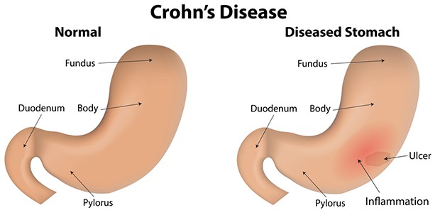 Crohn’s Disease is an ongoing condition that causes inflammation of the digestive tract, or the GI (gastrointestinal) tract (the gut). Crohn’s disease may also be called ileitis or enteritis.